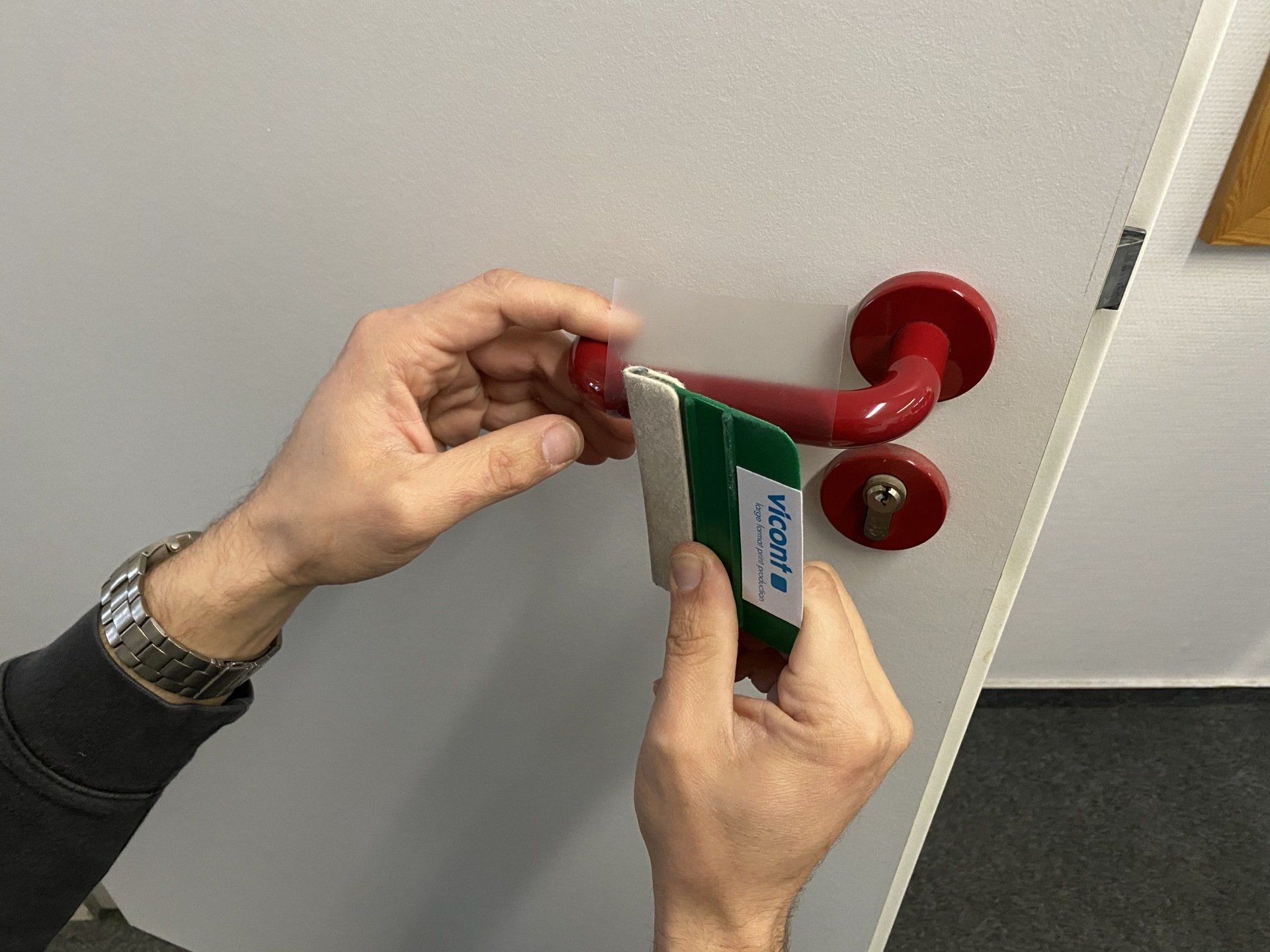 Die selbstklebende Schutzfolie mit antimikrobiellen Eigenschaften kann problemlos auf alle Arten von ebenen Oberflächen wie Tischen und Türgriffen angewendet werden, wirkt gegen Viren (z.B. Influenza virus A, Human Rotavirus, Coronavirus ) und Bakterien (z.B. Escherichia coli), verhindert die Ausbreitung und schützt vor Infektionen.